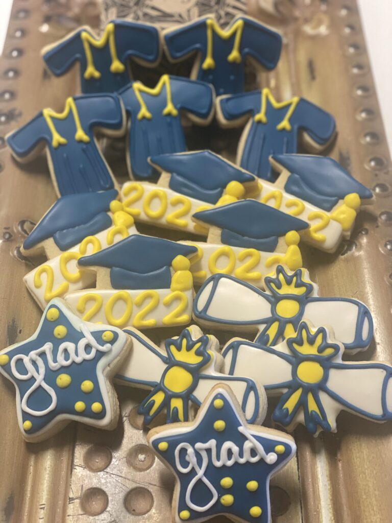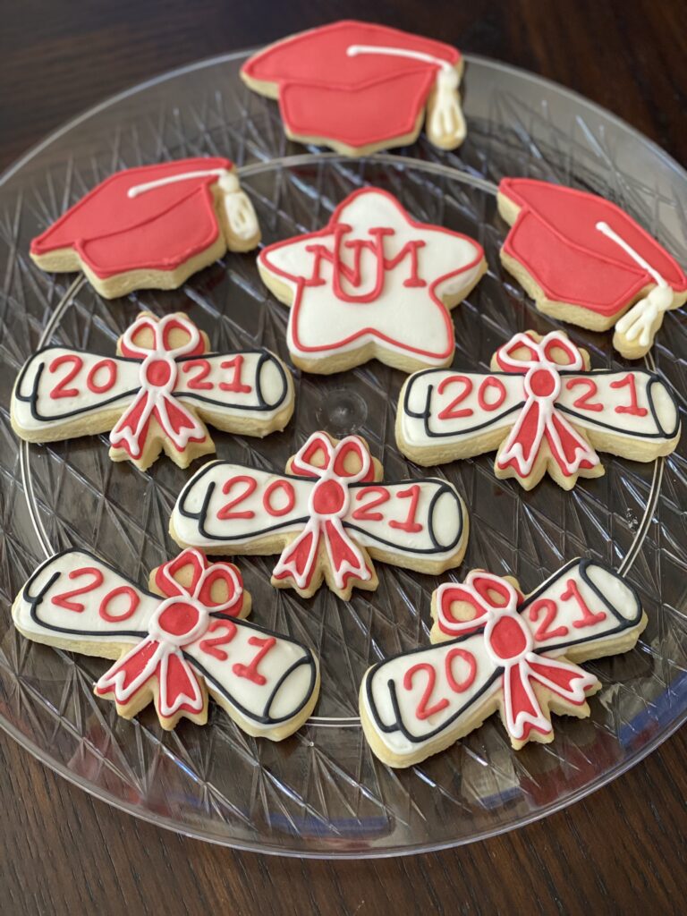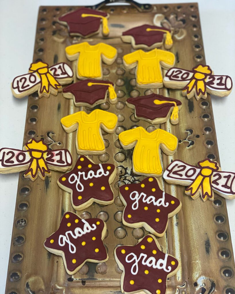 Graduation-themed decorated cookies for the class of 2021.