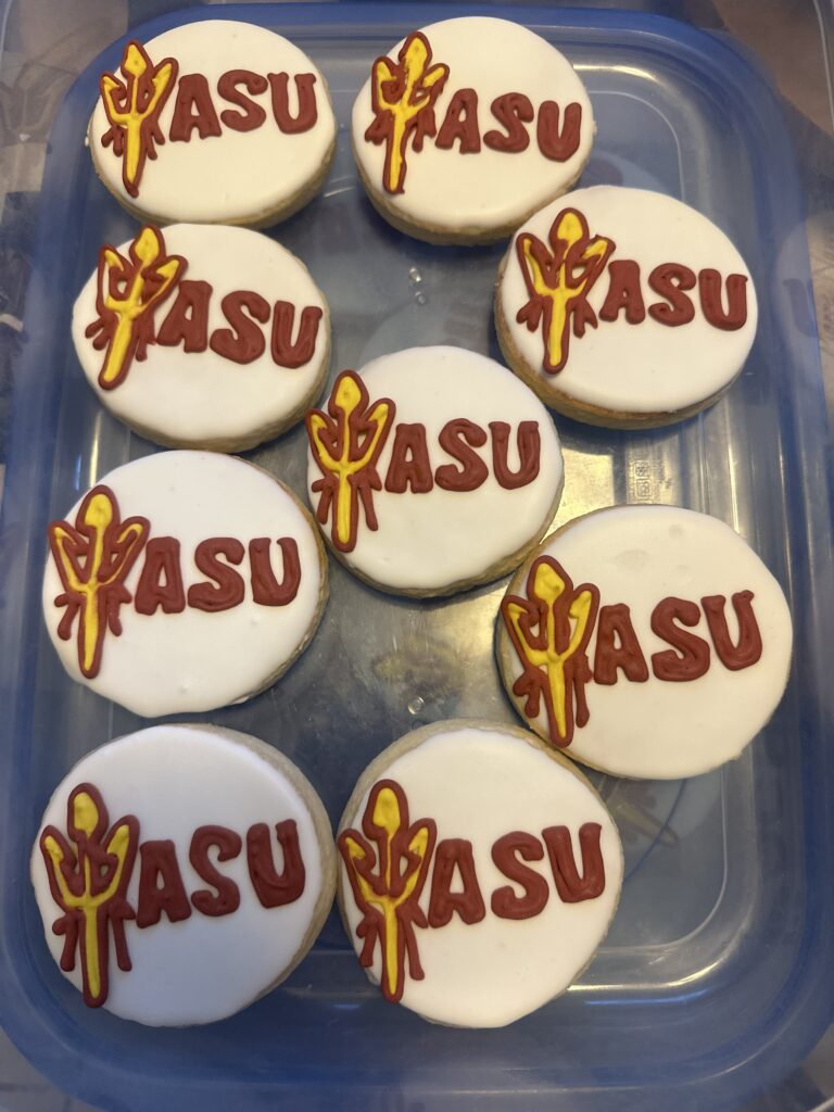 Decorated cookies featuring ASU logos and bows on a tray.