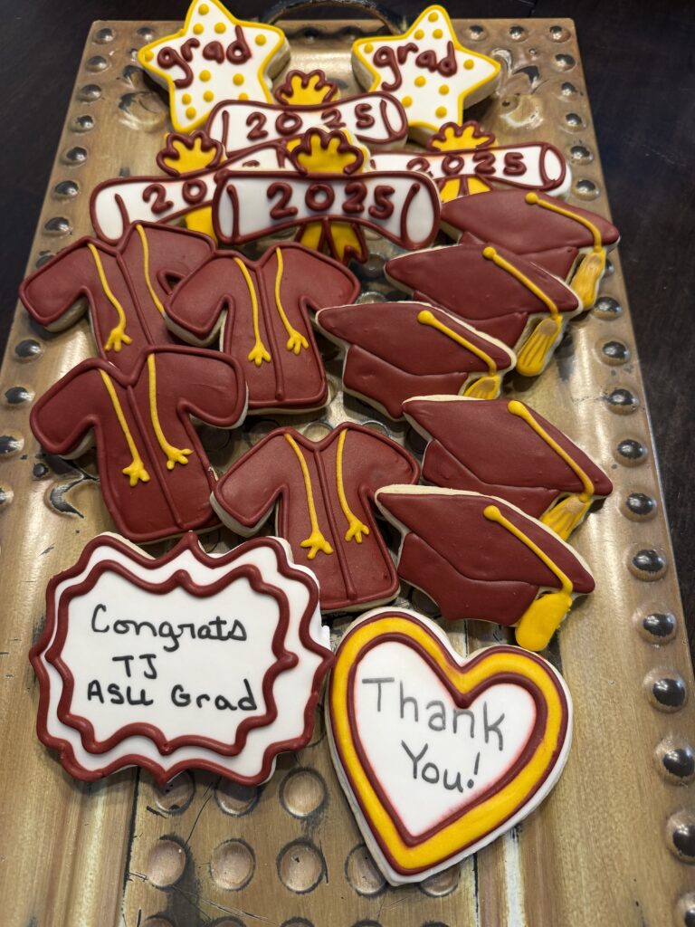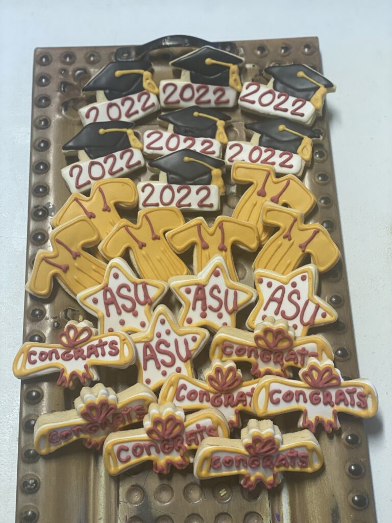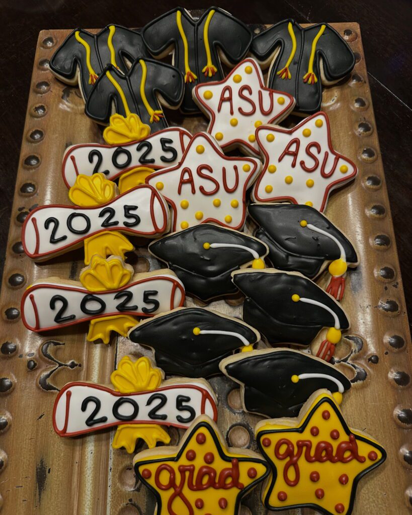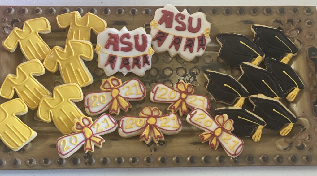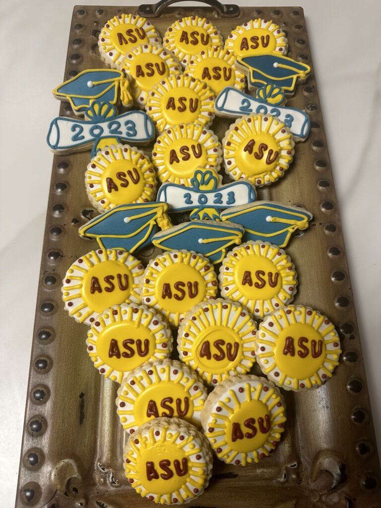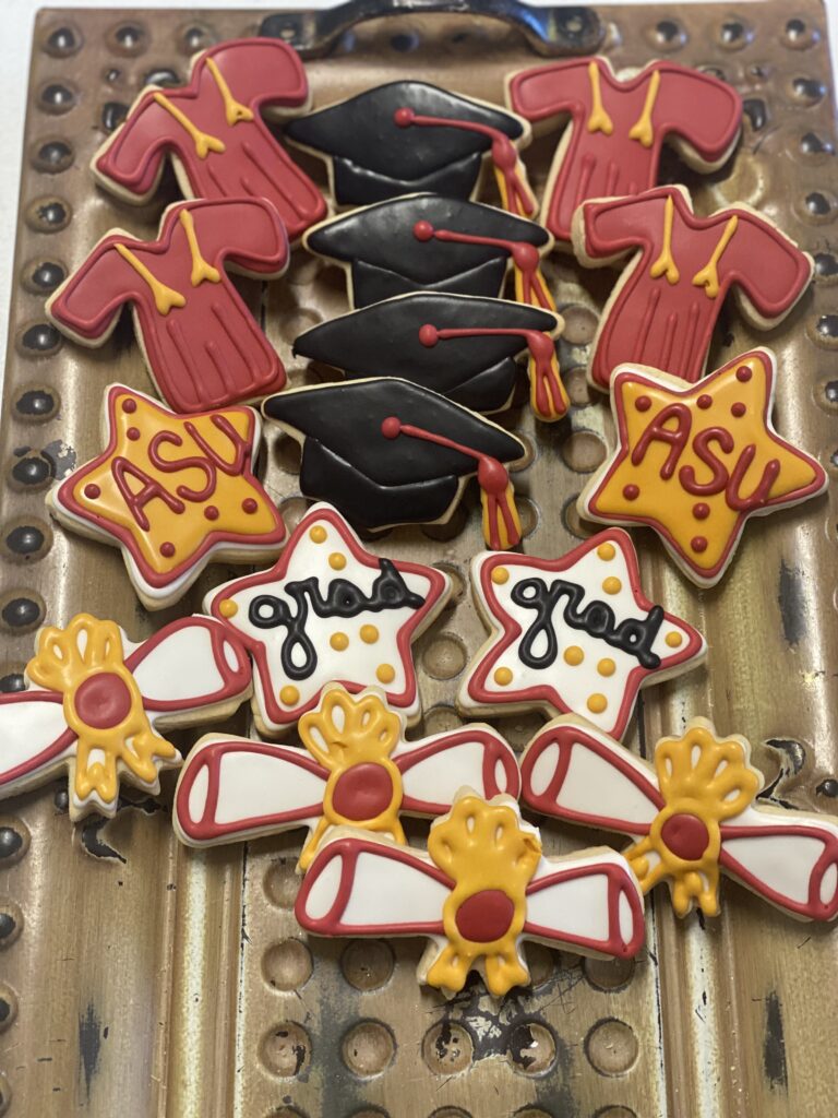 Graduation-themed cookies with caps, diplomas, and ASU logos.