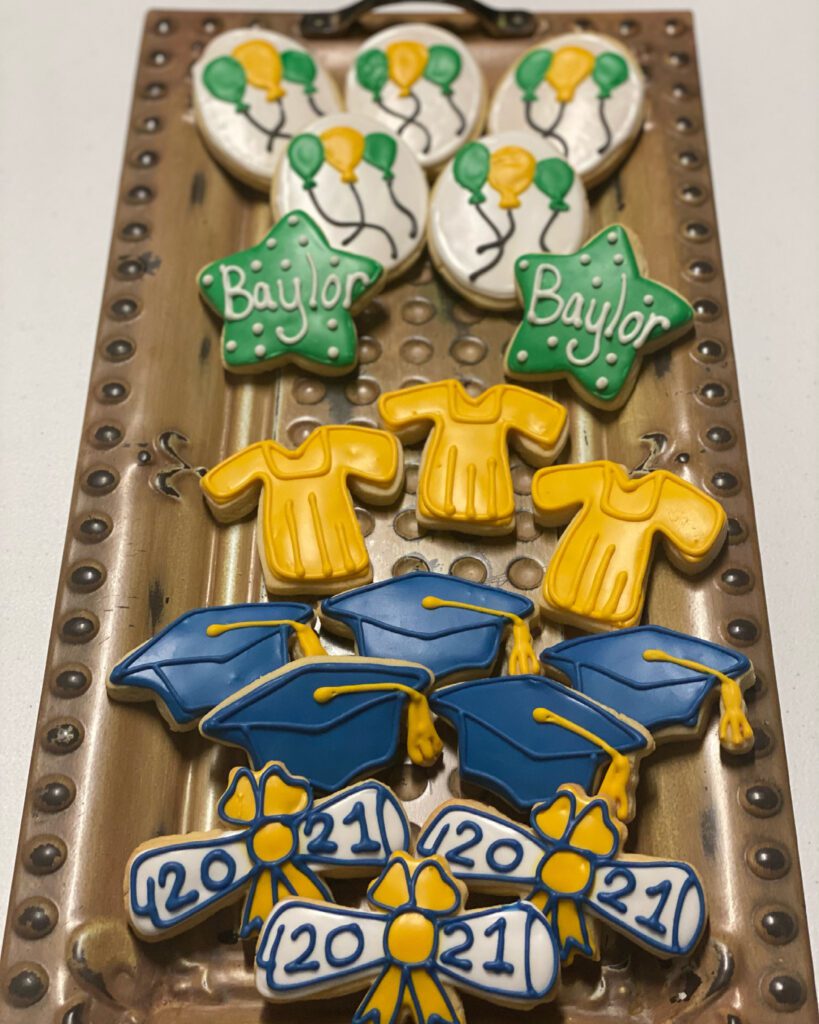 Graduation-themed cookies with caps and Baylor shirts in a box.