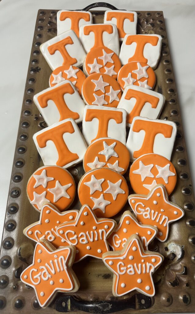 Orange and white cookies with stars and the letter 'T' for Gavin.