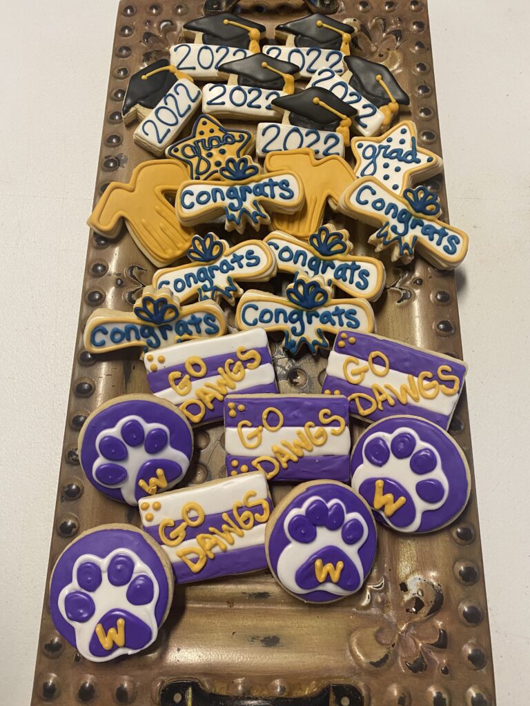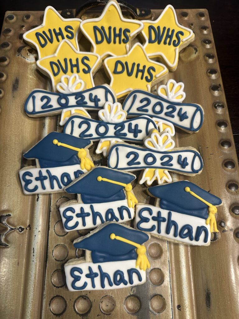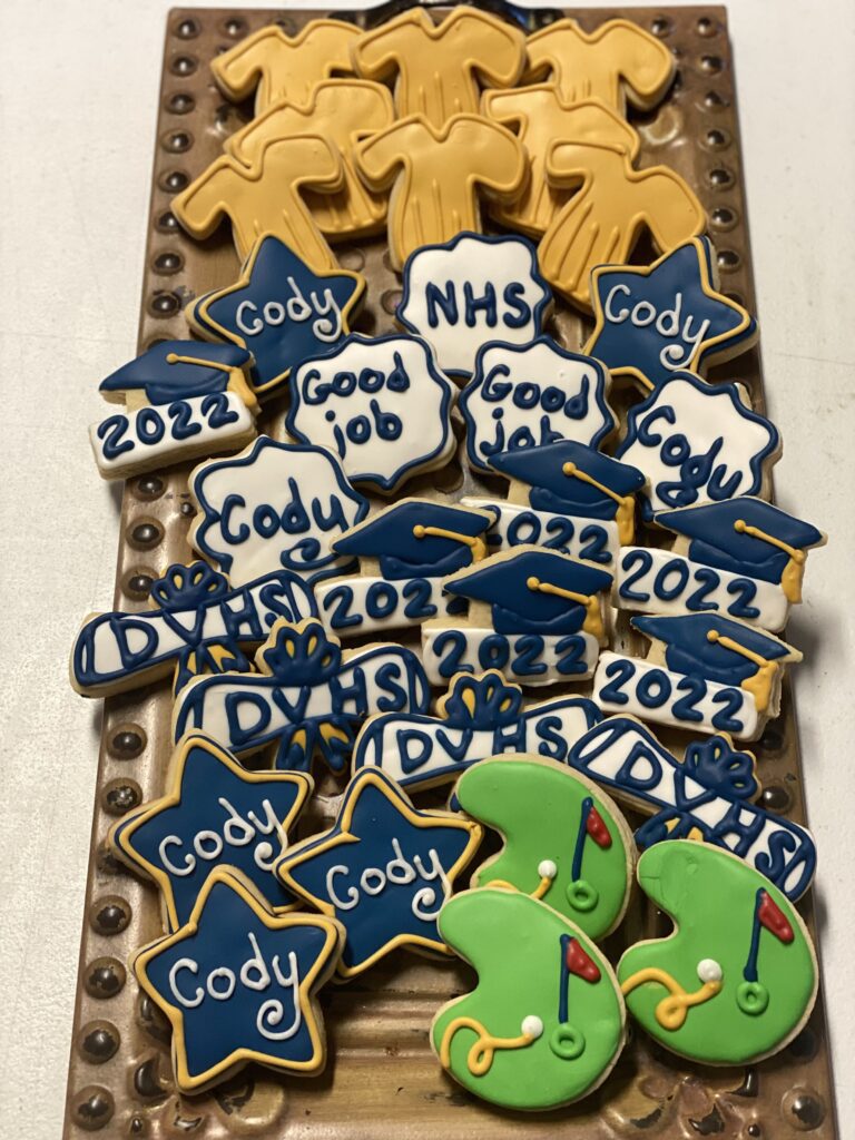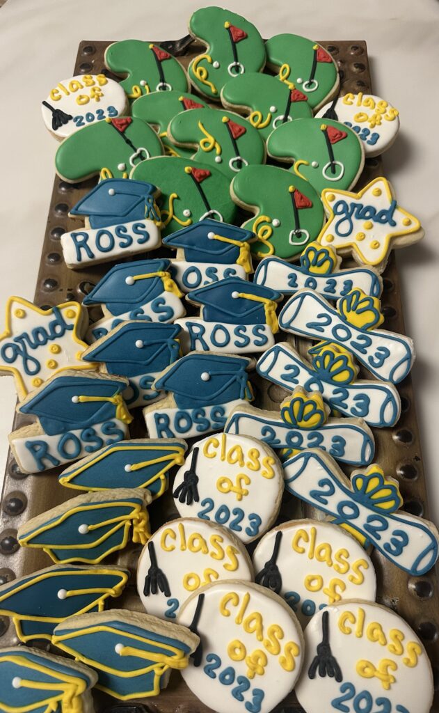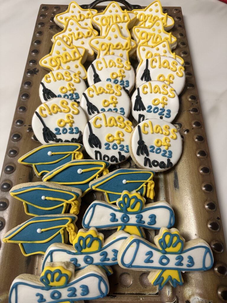 Decorated cookies for a graduation event, featuring names, class year, and congratulatory messages.