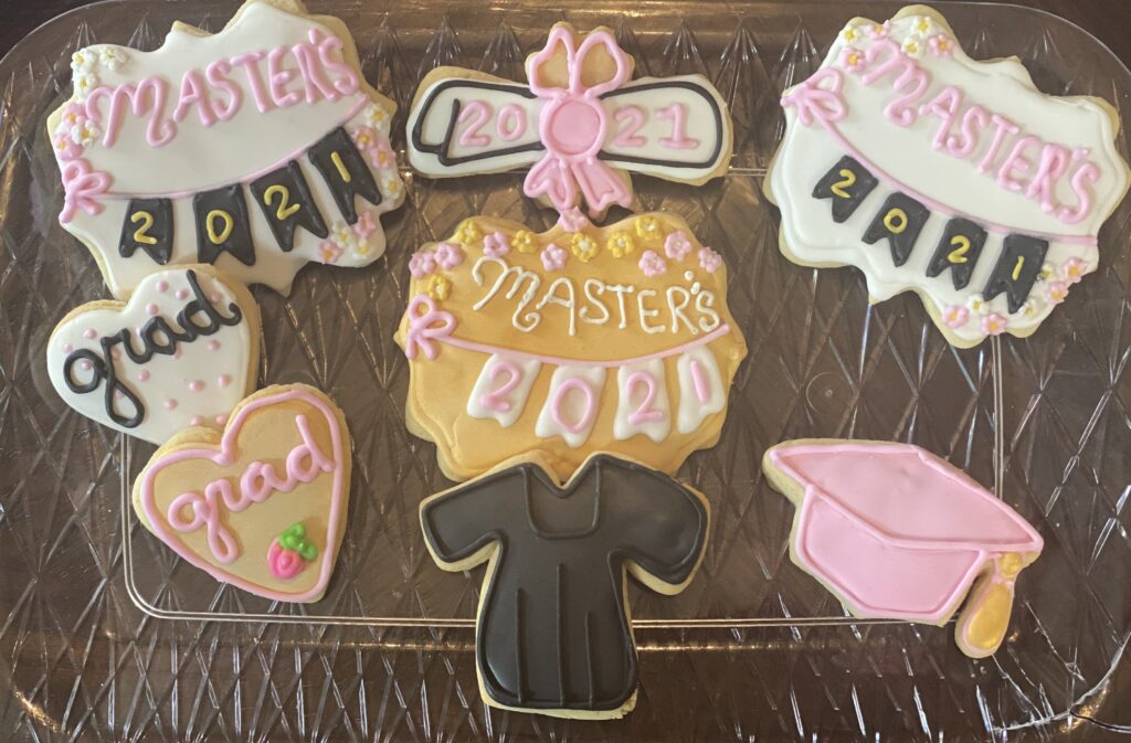 Decorated cookies celebrating a 2021 master's graduation.