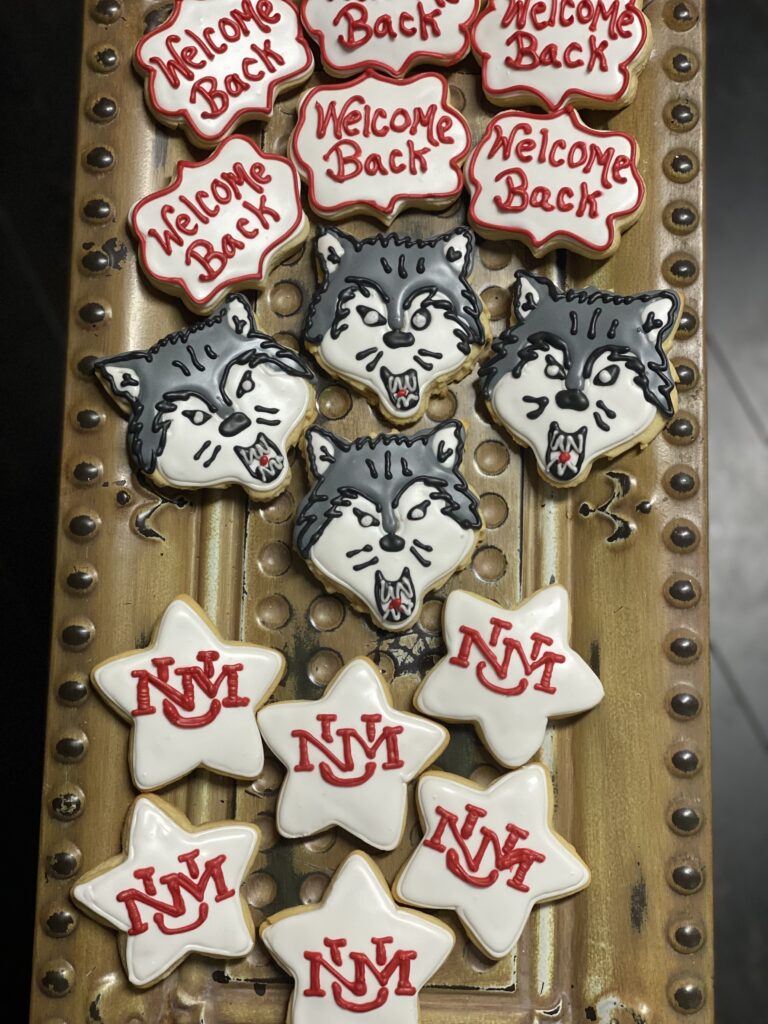 Decorative cookies featuring husky faces and 'Welcome Back' messages.