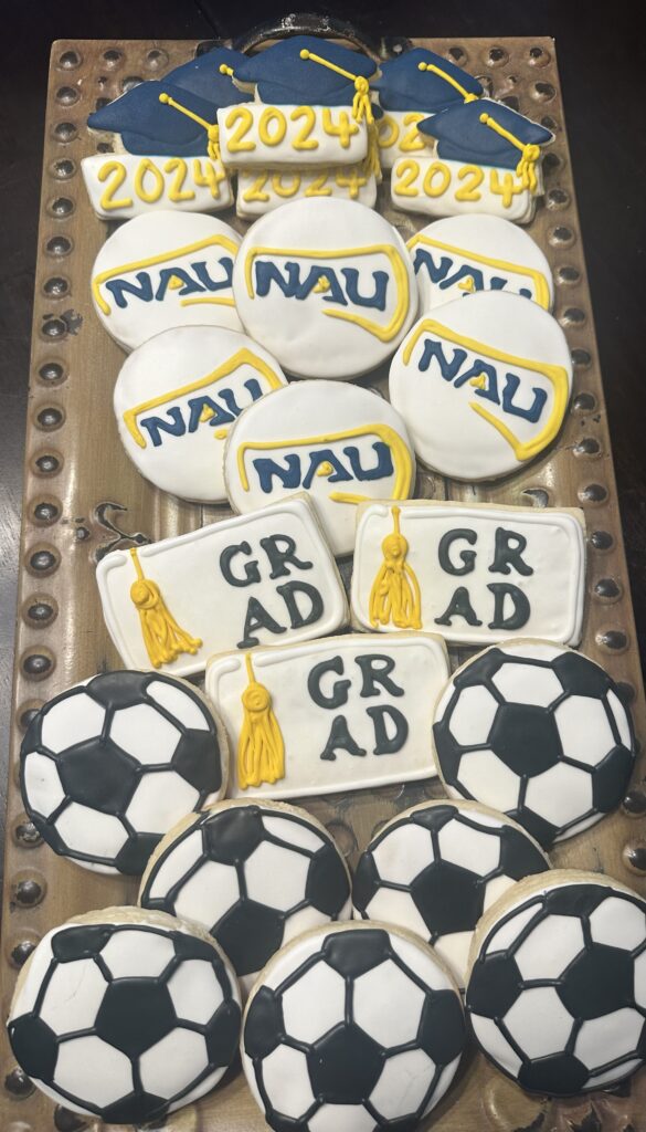 Graduation and soccer-themed decorated cookies with NAU logos.