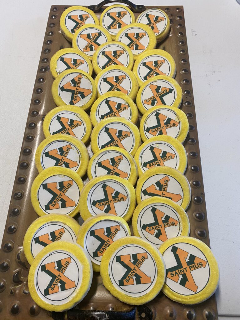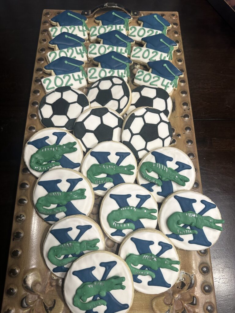Decorated cookies with soccer and Xavier University themes.