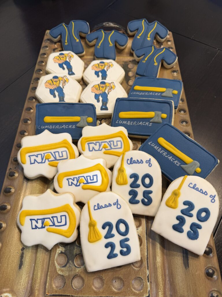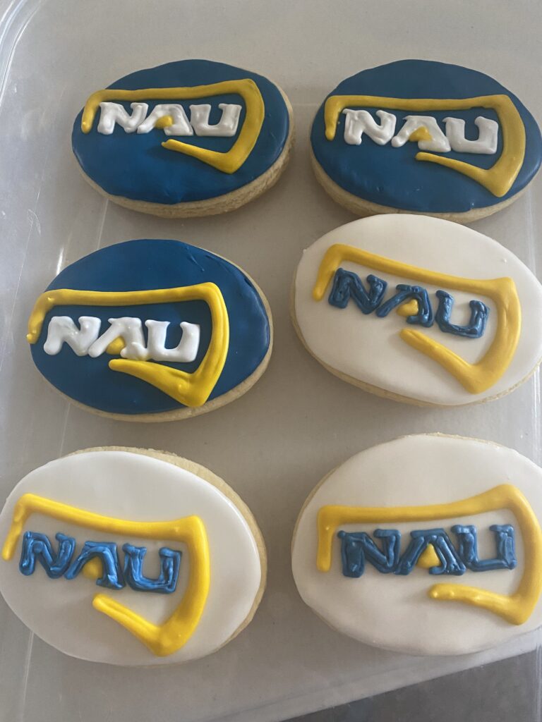Decorated cookies with NAU logo in blue, yellow, and white.