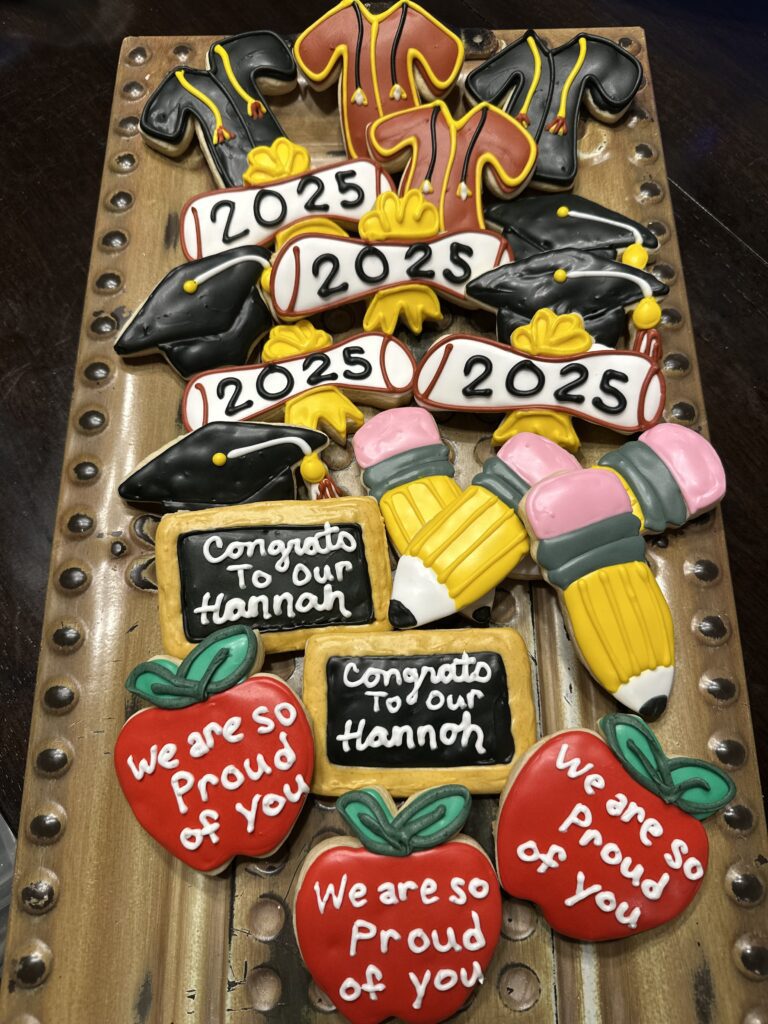 Decorated cookies celebrating a 2025 class with school-themed designs.