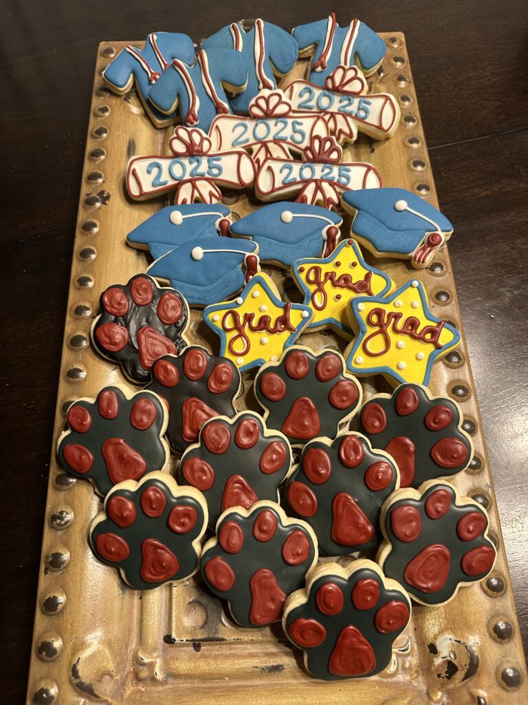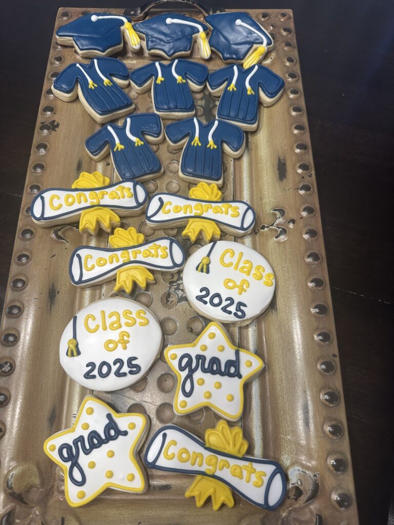 Custom decorated graduation cookies celebrating the class of 2025 with personalized messages.
